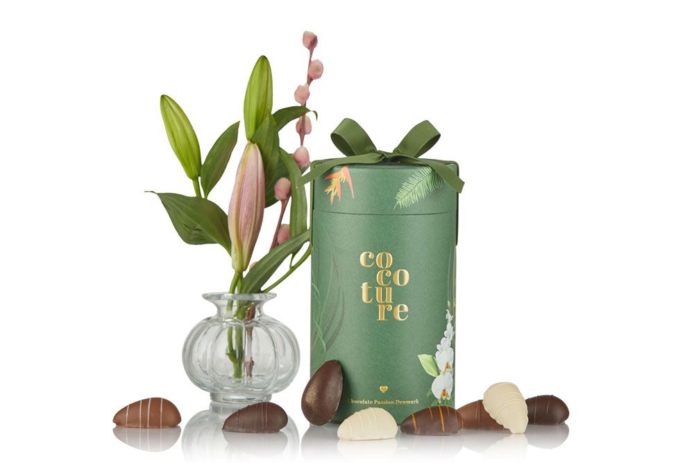 Smuk grøn hatteæske med mix af marcipanæg fra lækre Cocoture.