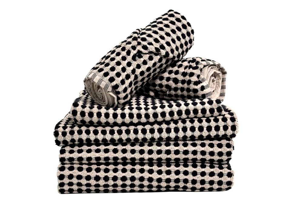 Håndklæderne er udført med et enkelt og alligevel særpræget mønster med grafiske, sorte prikker, der er i flot kontrast til baggrundsfarven i en varm beige nuance. Kanten er lavet tone i tone, hvilket giver en fin detalje til det mønstrede look.
