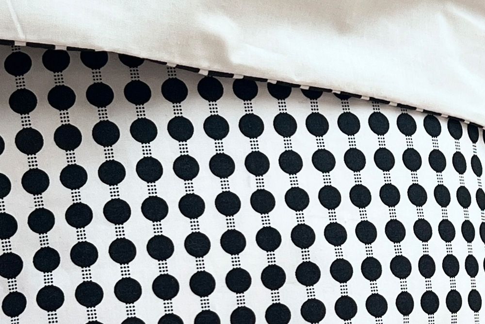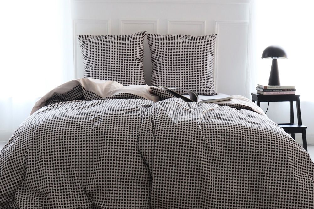 Sengetøjet fra Cotton Lover er både blødt, lækkert og stilrent. Det fine dobbeltsidede design har et grafisk prikket mønster i sort og beige på den ene side og ensfarvet på den anden, hvilket giver mulighed for at ændre udseende alt efter humør uden at skulle skifte sengetøj.
