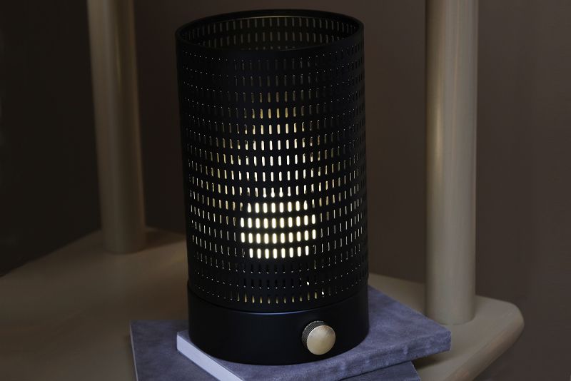 Den ledningsfrie lampe oplades via det medfølgende kabel og lysstyrken justeres nemt ved at dreje på knappen på fronten.