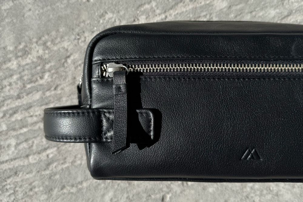 Toilettasken har en praktisk lynlåslukning og en funktionel læderstrop, der gør det nemt at hænge den op på badeværelset.