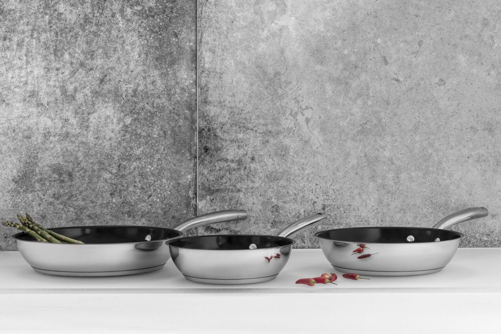 Stegepanderne har en konisk form og er fremstillet i blankpoleret rustfrit stål med en tredelt sandwichbund med en kerne af jern, hvilket er med til at give en superb varmefordeling. Panderne er belagt med Fusion keramisk nonstick-belægning, som er fri for PFAS og er mere hårdfør end almindelige nonstick-belægninger.