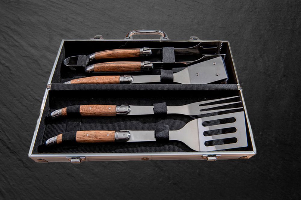 Grillsættet består af spatel, tang, stegegaffel og børste, der er fremstillet i rustfrit stål med et elegant træhåndtag med den velkendte Laguiole-cikade på. Sættet leveres i en robust aluminiumskuffert så det er nemt at opbevare.