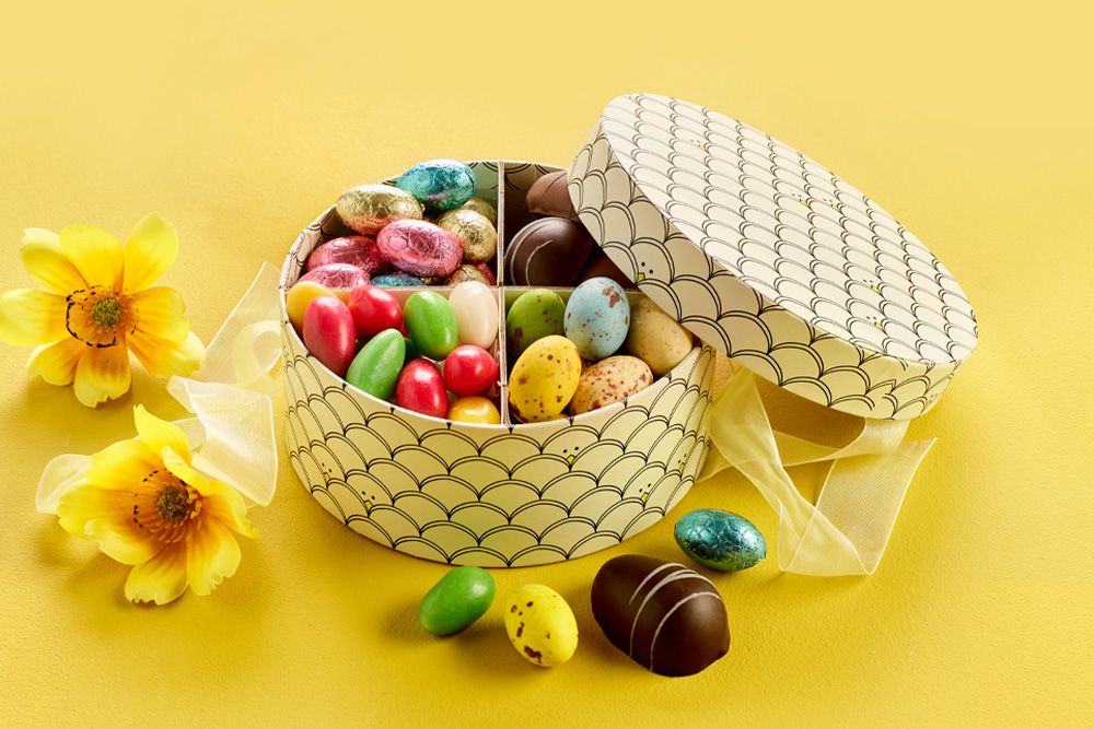 Denne elegante hatteæske gemmer på et skønt påskemix fyldt med noget for enhver smag. Æsken indeholder en varieret blanding af pralinéæg, klassiske marcipanæg, sprøde sukkeræg og udsøgte gourmetæg. Den dekorative hatteæske fuldender oplevelsen.