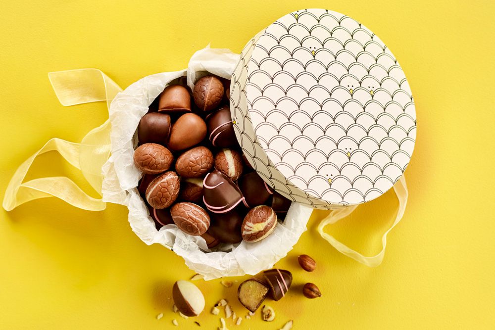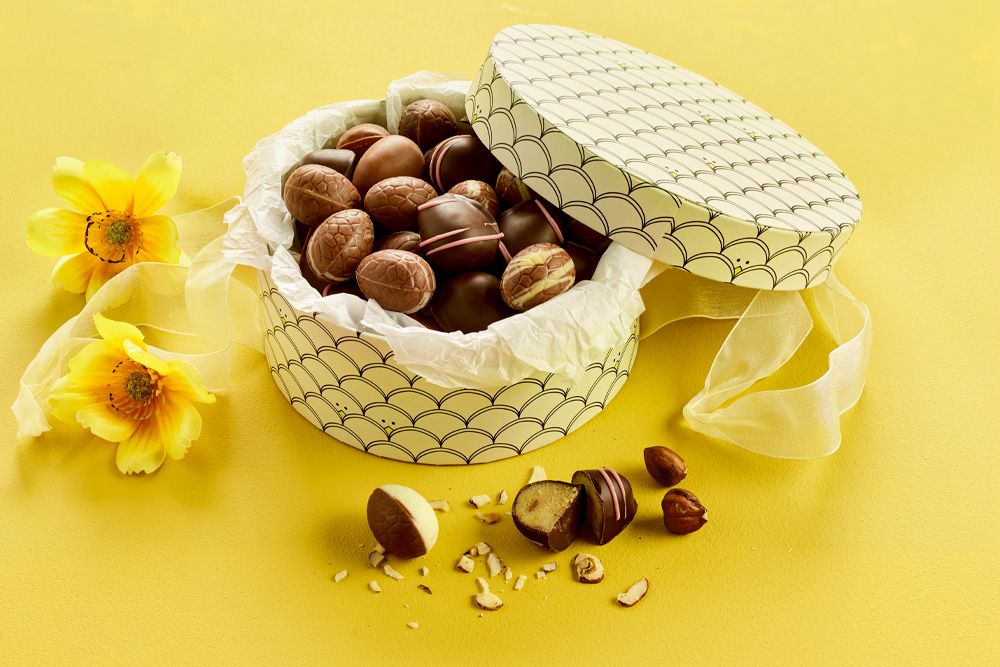 Gå på opdagelse i denne flotte hatteæske fyldt med smagfulde herligheder. Indholdet byder på lækre marcipan- og luksusæg, nøje udvalgt for deres høje kvalitet og fine smag – en harmonisk kombination, der indbyder til nydelse og hyggelige påskestunder.