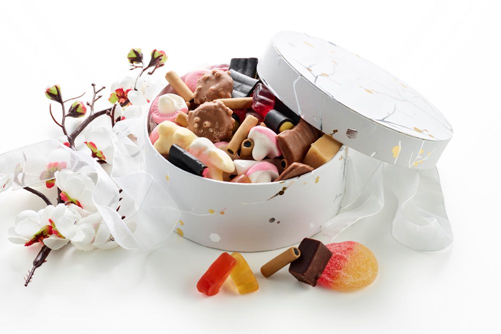Gå på opdagelse i denne fine hatteæske pyntet med en dekorativ sølvgren og fyldt med lækre, søde fristelser. Indholdet byder på en skøn variation af blandet slik, så der er lidt for enhver smag – perfekt til hyggelige stunder og små øjeblikke med ekstra forkælelse.