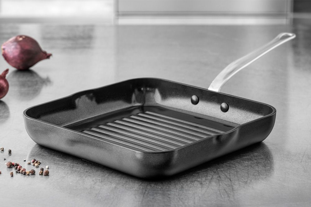 Det ergonomisk designede håndtag i rustfrit stål giver et sikkert og komfortabelt greb – også under høj varme. Grillpanden egner sig til alle typer komfurer, inklusive induktion, og tåler ovnvarme op til 220 °C.