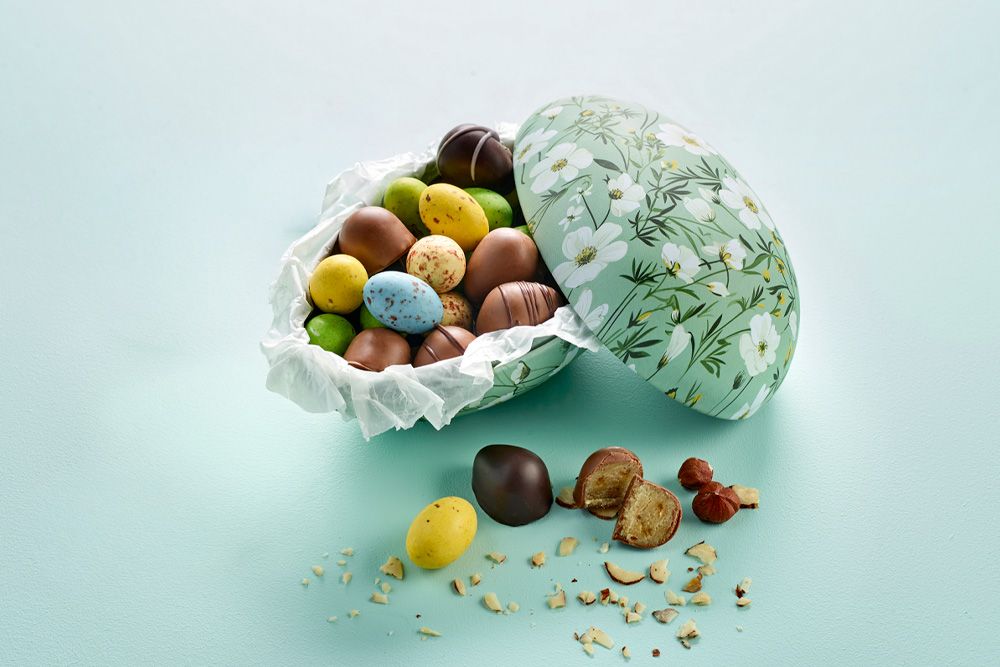 Et smukt metalæg med blomster, fyldt med lækre gourmet- og marcipanæg – en skøn kombination til påskens søde øjeblikke. Ægget har et elegant og dekorativt udtryk, og indholdet byder på en lækker variation af fyldige smagsnuancer i chokolade og marcipan.