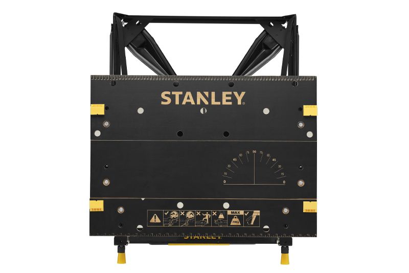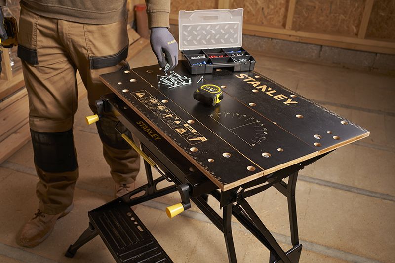 Smart sammenklappelig og multifunktionel arbejdsbænk med skruestikke med vertikal klemme samt åben værktøjstaske fra Stanley