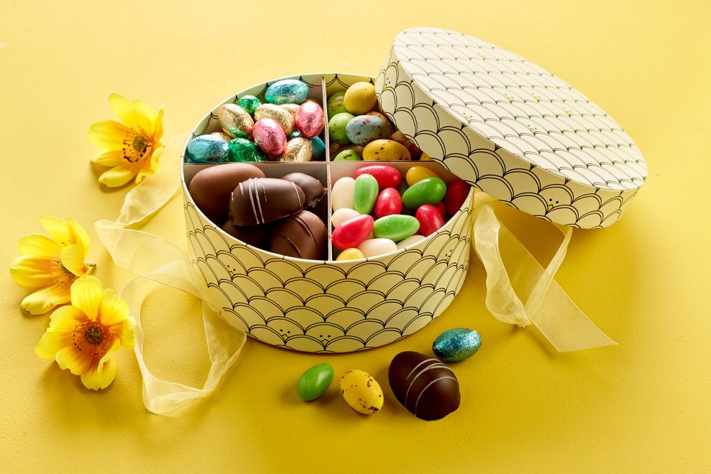 Denne elegante hatteæske gemmer på et skønt påskemix fyldt med noget for enhver smag. Æsken indeholder en varieret blanding af pralinéæg, klassiske marcipanæg, sprøde sukkeræg og udsøgte gourmetæg. Den dekorative hatteæske fuldender oplevelsen.