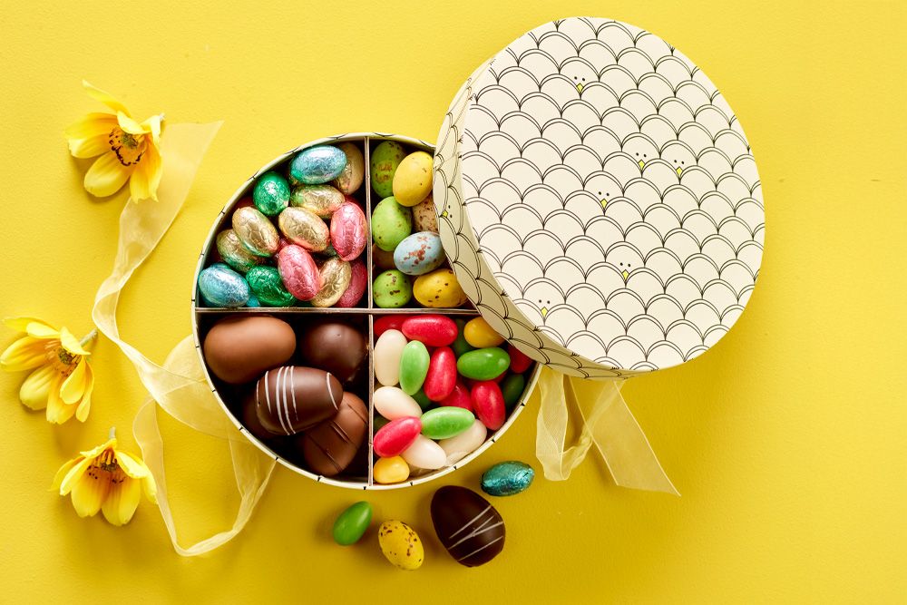 Mønstret hatteæske med blandet påskeæg - 850 g