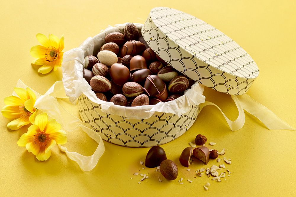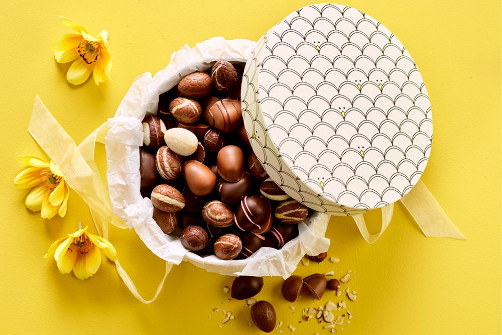 Gå på opdagelse i denne flotte hatteæske fyldt med smagfulde herligheder. Indholdet byder på lækre marcipan- og luksusæg, nøje udvalgt for deres høje kvalitet og fine smag – en harmonisk kombination, der indbyder til nydelse og hyggelige påskestunder.
