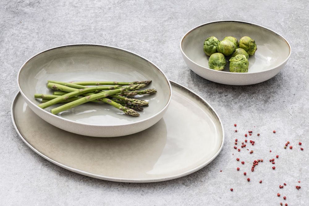 Skålene og fadet har en ru, nopret underside, der står i fin kontrast til den glatte og grønlige, glaserede overside. Glaseringen er fremstillet i hånden, så der kan være variationer af den grønlige nuance, hvilket gør hver del unik og er med til at understøtte det rustikke, rå look.