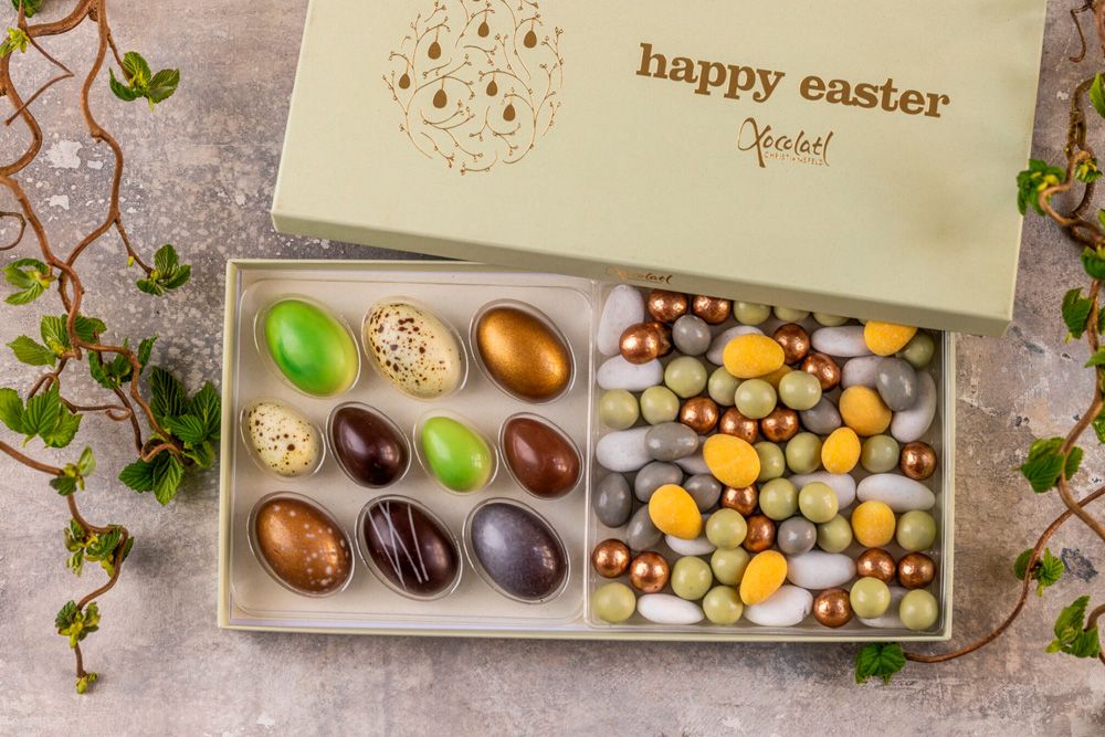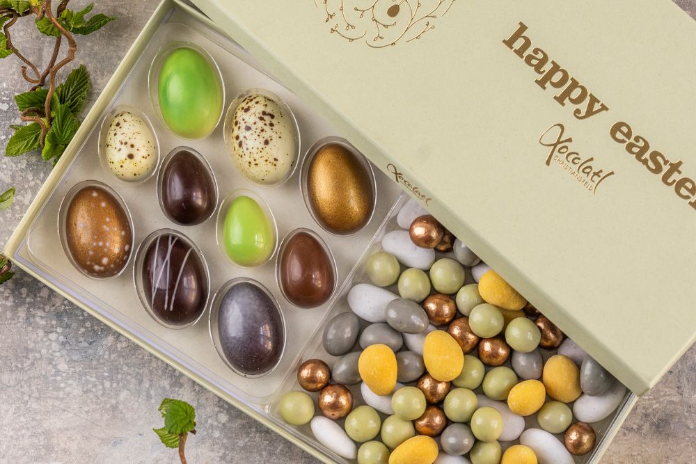 Æsken byder også på et skønt dragémix med blandt andet chokolademandler og lakrids, som giver ekstra knas og variation. En perfekt kombination af fyldige chokolader og sprøde favoritter til påskens søde øjeblikke.