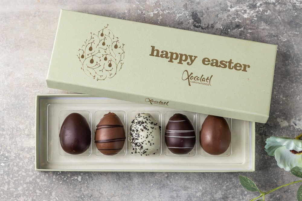 5 stk. lækre marcipanæg fra Xocolatl i skønne smagsvarianter med nougat, ren marcipan, lakrids, cognac og solbær. En klassisk og fyldig smagsoplevelse med blød marcipan i fokus – perfekt til påskens små forkælelsesøjeblikke.